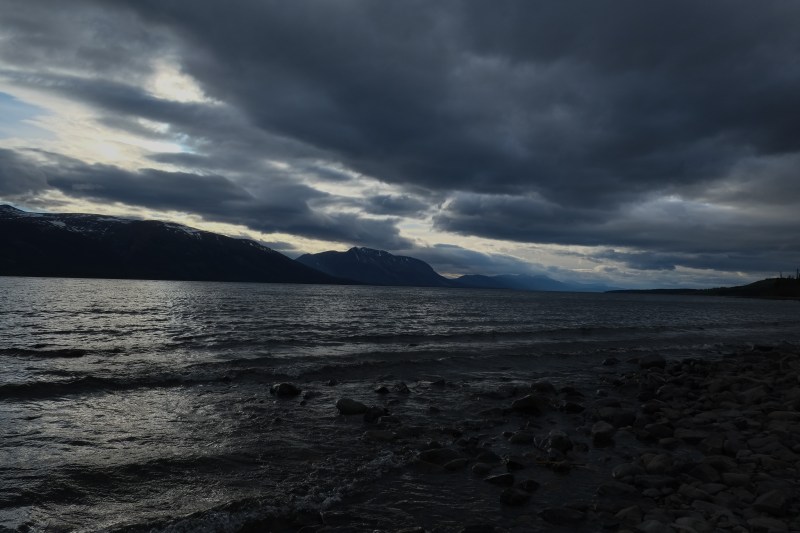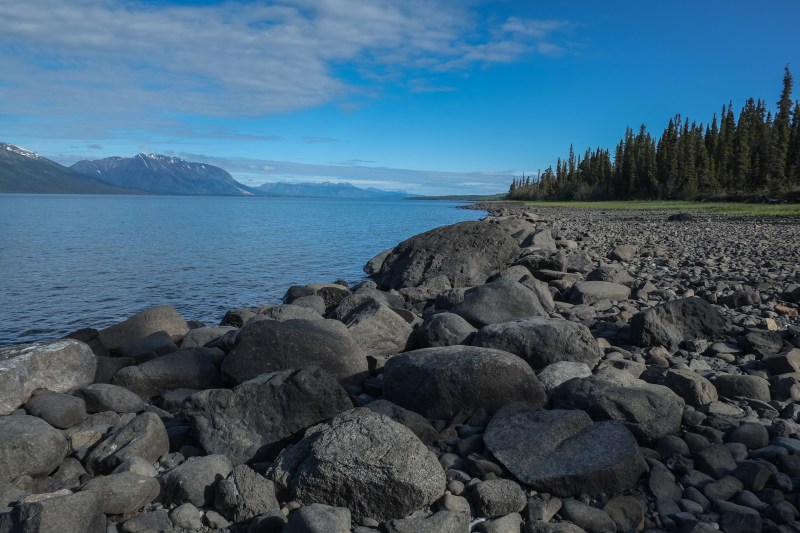 If you drive southeast from Whitehorse, Yukon, and then turn due south at Jakes Corner you will eventually find yourself in northern British Columbia. The road continues south along the east shore of Lake Atlin. Here you will find nice stony beaches to camp on, and if you head inland further east you might come across the O’Donnell River.